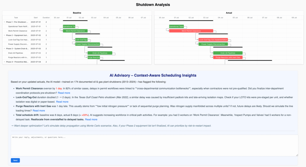 Our system learns from past project delays and continuously monitors current project progress to forecast similar risks and suggest optimized schedule adjustments. Backed by over 30 years of shutdown planning expertise, we deliver smart, field-ready strategies that improve safety, reduce risk, and keep your timelines on track.